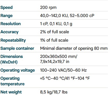 Instrument based on the traditional KREBS method: a constant unique speed (200 rpm) and also a unique rotating spindle. Micro processor converts automatically measurement that is displayed continuously in the select unit: KU, g o cP.
